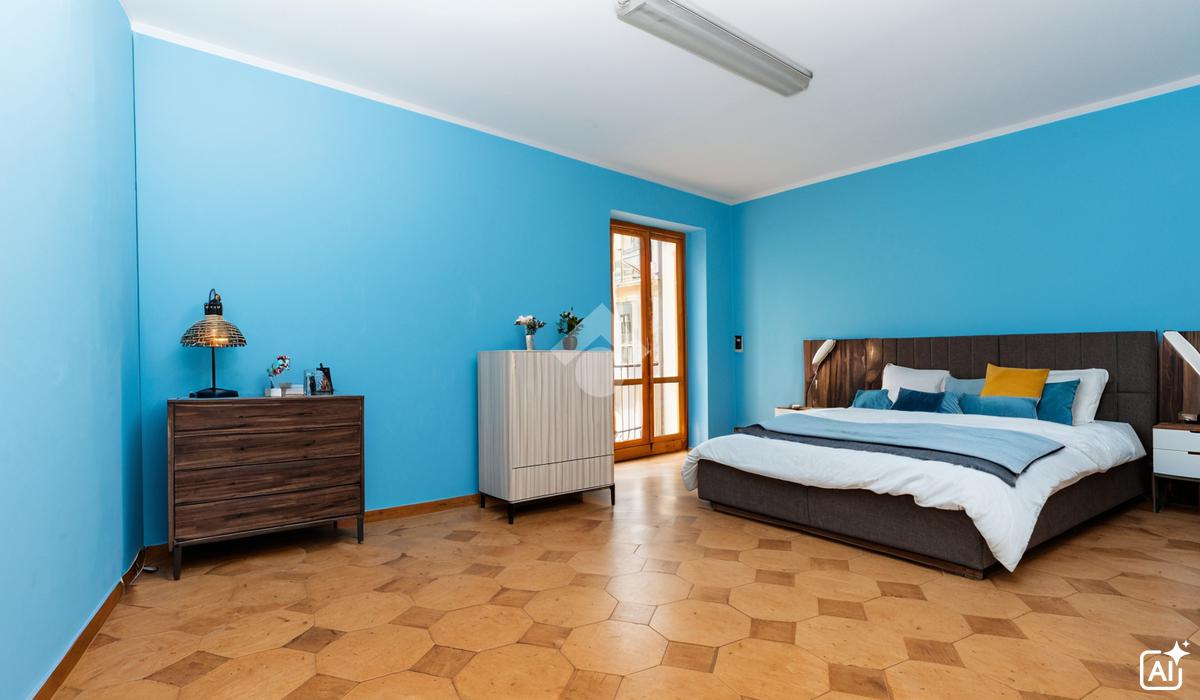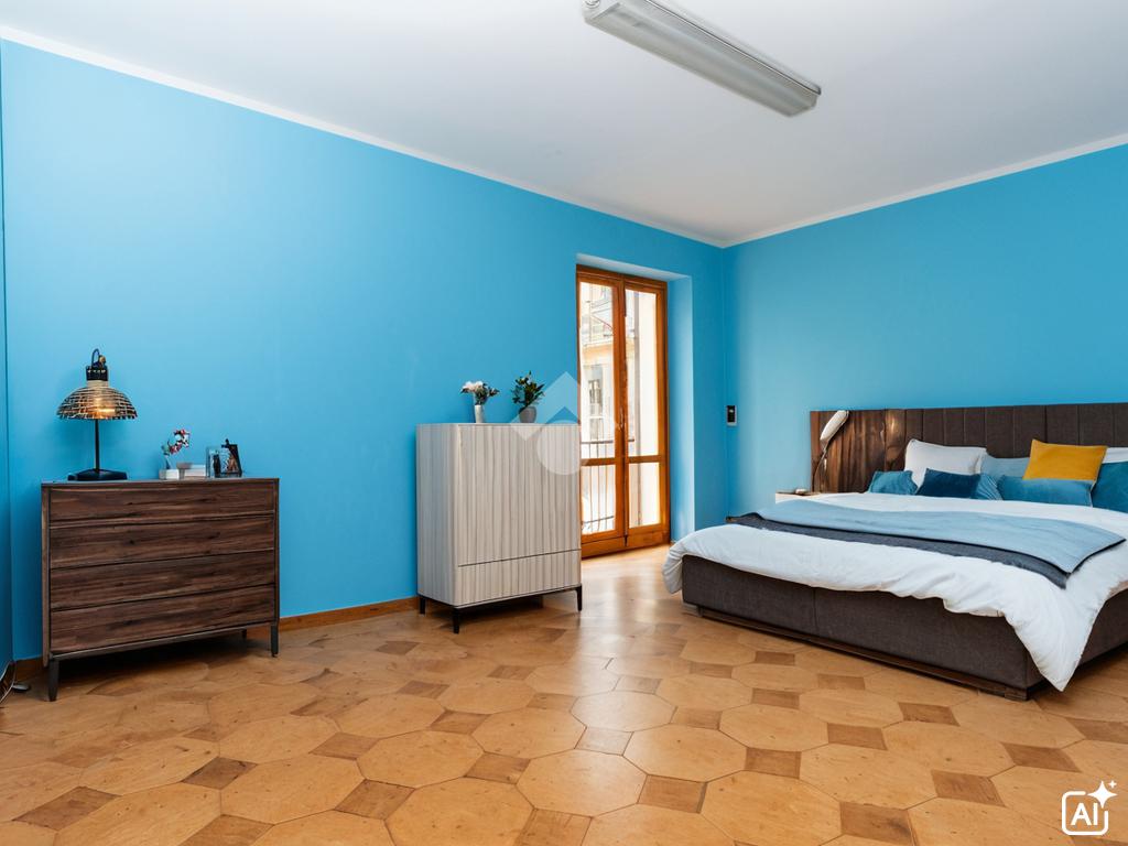 Al primo piano l'alloggio presenta spazi ampi ed in generale luminosi: la zona giorno con il cucinino si affaccia sulla piazza e ha l'accesso al balcone che si collega con il bagno e ad una delle due camere da letto.